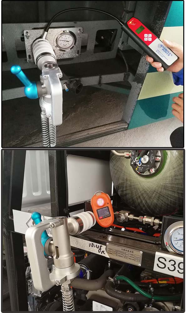 在加氢站现场,技术人员了解了现场加氢实际工况条件后,在场站人员配合下顺利完成了DN12和DN8两种口径加氢枪的安装工作。在加注过程中,站上的技术人员利用高灵敏度便携式氢气探测器对加氢枪与加氢口连接处以及其他可能存在漏点的连接点进行详细的探测,检测结果显示(如图04、05所示)整个加注周期未检测到氢气介质泄漏,达到 “零”泄露标准。